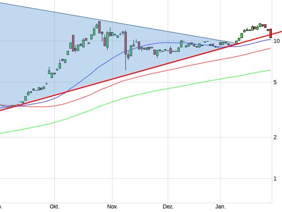 Nach Ausbruch nach oben aus dem Dreieck nach oben sah es wirklich gut aus, jetzt haben wir heute die unterstützungslinie (rot) unterschritten, befinden uns aber noch so gerade oberhalb der 38 Tagelinie (blau). Wenn wir im Laufe der Woche wieder grün sehen, bin ich optimistisch. Ansonsten sieht es charttechnisch eher schwach aus...
