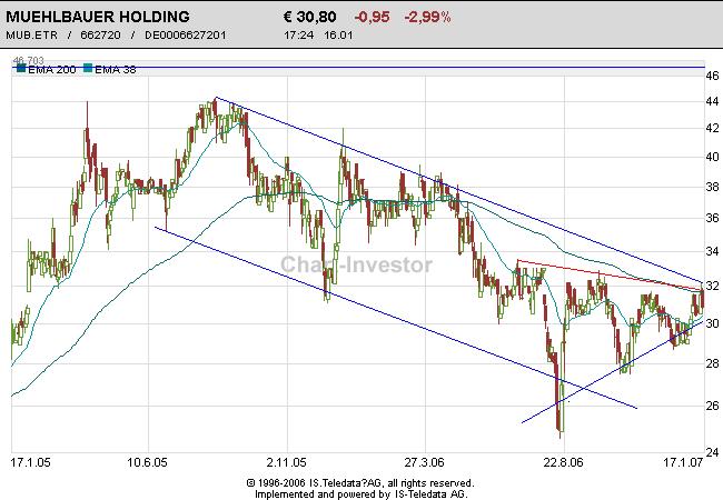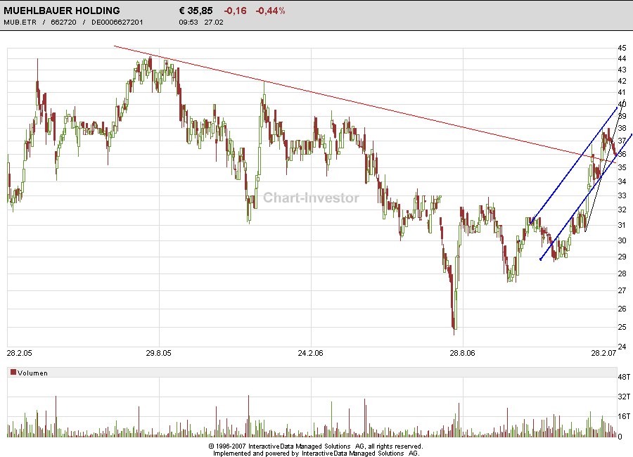 Rückblick: Die MÜHLBAUER Aktie vollendete am 24.01.2007 eine Bodenformation in Form einer inversen SKS, indem sie über die Nackenlinie ausbrach. Dadurch kam es zu einem mittelfristigen Kaufsignal, das die Aktie zu einer Aufwärtsbewegung bis ca. 44,00 Euro veranlassen sollte. In der letzten Woche notierte die Aktie bereits bei ca. 38,00 Euro. In dieser Woche fällt die Aktie stark zurück. Dabei fällt sie auf die Nackenlinie bei aktuell 31,90 Euro zurück. Im heutigen Tagesverlauf notierte die Aktie zwar schon darunter, aber sie erholt sich wieder über diese Marke. Bei 28,43 Euro verläuft aktuell der langfristige Aufwärtstrend.