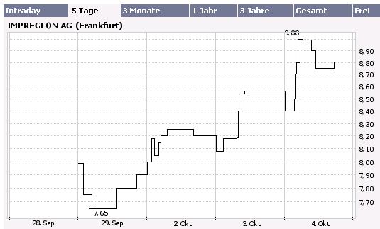 Als Impreglon Ende Mai an die Börse kam, wird es manche lange Gesichter gegeben haben: Die Aktie wurde zu 6,50 Euro zugeteilt, rutschte am ersten Handelstag aber auf 5,70 Euro. Seitdem zeigt der Trend indes nach oben, vor wenigen Tagen erreichte der Aktienkurs ein neues Rekordhoch bei 8,84 Euro. Am Freitag vormittag kostete die Aktie 8,60 Euro (Isin DE000A0BLCV5).