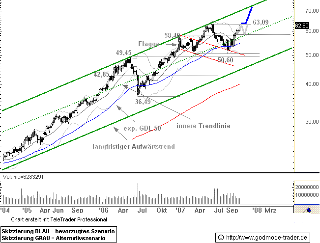 Rückblick: Die VEOLIA - Aktie befindet sich in einer langfristigen Aufwärtsbewegung. Diese führte die Aktie bis Mai 2006 auf ein Hoch 63,09 Euro. Anfang Juni 2006 kam es zu einem Ausbruchsversuch über dieses Hoch, der aber nicht gelang. Im Anschluss daran wurde der französische Wert deutlich abverkauft. Erst die Unterstützung bei 50,60 Euro bot Mitte August Halt. Seitdem zieht der Wert deutlich an und nähert sich nun bereits dem Hoch aus dem Mai stark an.