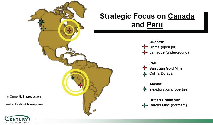 Quebec: Sigma (open pit), Lamaque (underground) Peru: San Juan Gold Mine, Colina Dorada Alaska: 9 exploration properties British Columbia: Carolin Mine (dormant)