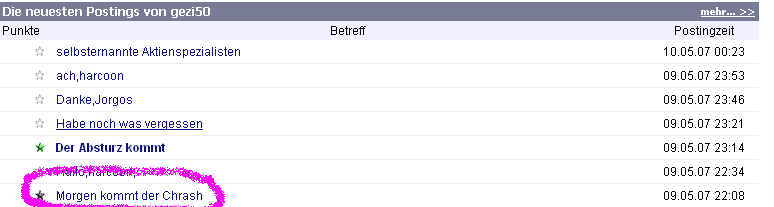 Wer dann noch tiefer in die gähnend leeren Aussagen wie u.a. der Mai ist noch nicht vorbei oder G.W. Bush wird auf dem China Böller sitzen, schaut, der wird schnell feststellen, daß hier ein gänzlich Ahnungsloser versucht mit aufgefangenen Schlagworten ohne Background versucht, auf sich aufmerksam zu machen, bissel ärmlich, dat geht im Talkforum, hilfsweise im Pusher oder Hot-Stockforum, aber doch bitte nicht hier ? |