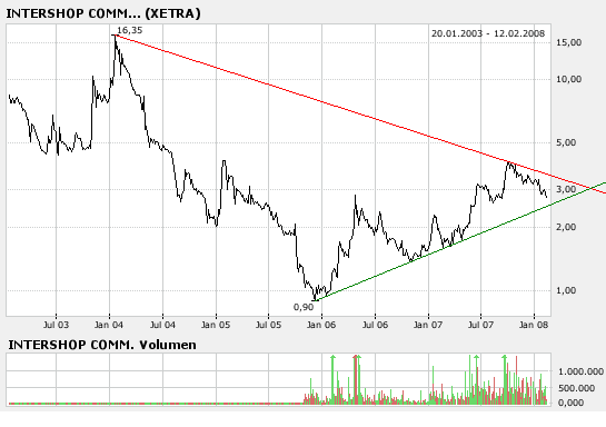 Fundamental: Ähnlich wie Broadvision ist die Intershop Communications in erster Linie ein Anbieter von eCommerce Software. Daher verlief auch die Geschichte des Unternehmens ähnlich. Einst als Börsenstar am Neuen Markt hochgejubelt, begann dann der tiefe Fall - auch wegen grober Fehler des Managements um Ex CEO Stephan Schambach. Doch ähnlich wie Broadvision hat sich auch Intershop gefangen, wenngleich es hier keinen Retter à la Vector Capital gab, sondern die Kleinaktionäre durch etliche Kapitalerhöhungen das Unternehmen gleich mehrfach gerettet haben. Nach einer kompletten Umstrukturierung scheinen die Geschäfte nun aber wieder deutlich besser zu laufen. Dies gilt nicht nur für das ehemalige Software-Kerngeschäft, sondern auch für das neu aufgebaute Fullfillment. Etliche Insiderkäufe durch Aufsichtsratschef Michael Sauer und den neuen CEO Andreas Riedel zeigen jedenfalls, dass der zuletzt in den Zahlen zum Ausdruck gekommene deutliche Aufwärtstrend weitergehen sollte. Daher halte ich die Aktie aus fundamentaler Sicht, trotz einer hohen Bewertung, für einen Kauf. Denn man muss berücksichtigen das Unternehmen in Turn-Around Situationen oftmals ein hohes KGV aufweisen und daher berücksichtige ich solche Kennzahlen hier ausnahmsweise einmal nicht!