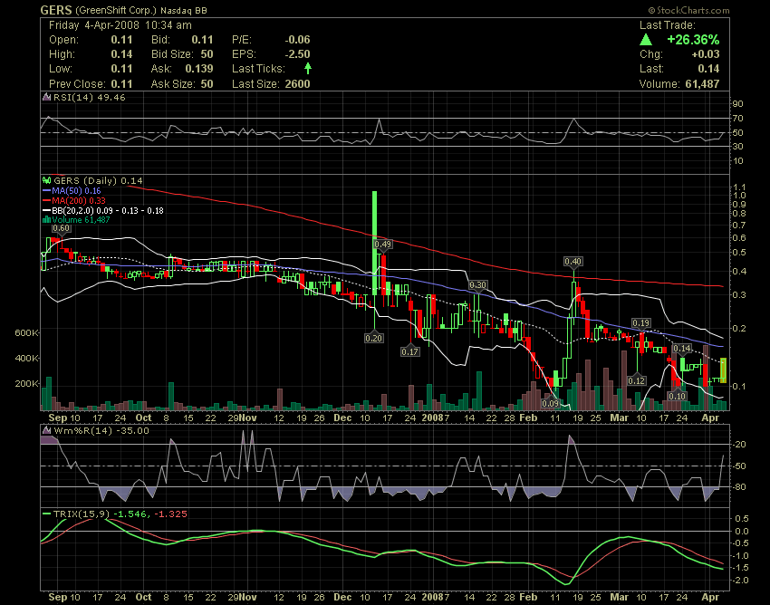 GreenShift Corporation (OTCBB: GERS), a company that through its subsidiaries, develops and commercializes clean technologies that facilitate the use of natural resources, announced its financial results for three months ended March 31, 2008. Total revenue for the three months ended March 31, 2008 were $6.6 million, representing an increase of 552%, over the three months ended March 31, 2007. Gross profit for the three months ended March 31, 2008 was $1.8 million, representing a gross margin of 27.1%. This compared to $0.1 million or 9.7%, in the comparable period of the prior year. Net loss from continuing operations for the three months ended March 31, 2008, was $3,794,409 as compared to a loss of $4,357,564 from the same period in 2007. The company also announced that GreenShift and the owners of Biofuels Industries Group, LLC exchanged company stock in return for 100% of the equity of BIG. This transaction is currently in escrow pending receipt of all final post-closing deliverables. The stock fell by a penny, to finish the week at $0.09.