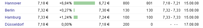 Jetzt hier zur Erinnerung aber doch ein Blick RÜCKWÄRTS auf die überstandene Zwangs-Verlinkung auf Berlin, die wahrscheinlich nur dadurch zu Stande kam, dass irgendein Rechner nach Head-Crash überhastet mit falscher System-Zeit neu aufgesetzt wurde, wodurch dann für die Börse Berlin schon am Freitag, dem 30.5.2008, Börsen-Kurse vom Samstag(!), dem 31.5.2008 angezeigt wurden, was dann wiederum dazu geführt hat, dass alle hiervon betroffenen Threads auf die "aktuelleren", weil in der Zukunft liegenden, Berliner Kurse umgetriggert worden sind: