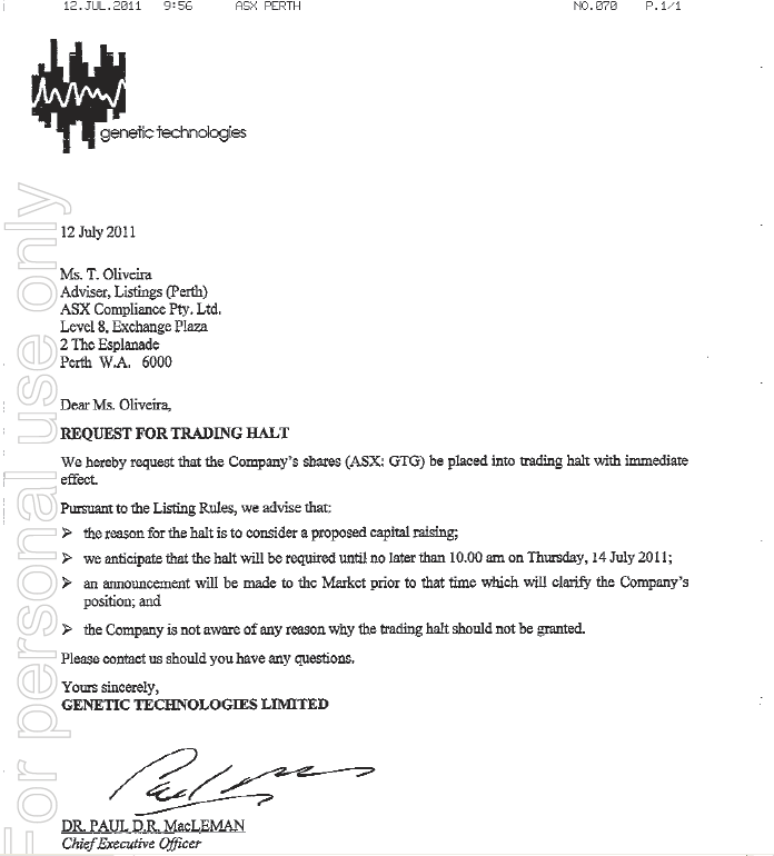 On July 12, the Australian biotech company made a request for a trading halt in its shares, on both the ASX and NASDAQ, to consider a proposed capital raising and ensure an orderly market. Am 12. Juli machten die australischen Biotech-Unternehmen einen Antrag für eine Handelsunterbrechung in ihrer Anteile, sowohl auf der ASX und NASDAQ, an einer geplanten Kapitalbeschaffung zu prüfen und zu gewährleisten einen geordneten Markt. It was anticipated that the halt will be required until no later than 10 am Thursday July 14. Es wurde erwartet, dass der Stillstand benötigt werden, bis spätestens 10 Donnerstag 14. Juli bin.