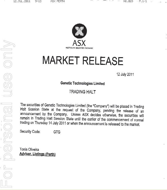 For investors who were twisting in the wind, following the sudden voluntary suspension of the securities of Genetic Technologies, here's the latest update from the company... Für Anleger, die in den Wind drehen waren, nach dem plötzlichen freiwillige Aussetzung der Wertpapiere von Genetic Technologies, hier ist das neueste Update von der Firma ...