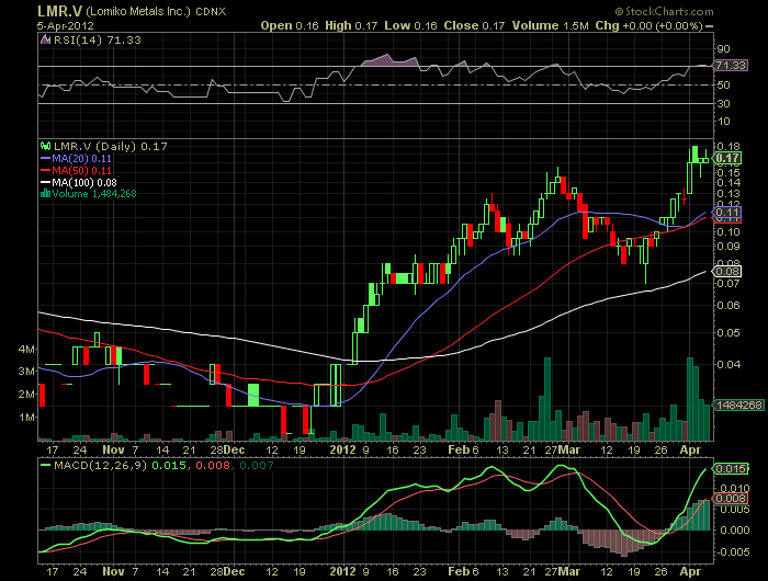 Lomiko Metals Inc. (TSXV: LMR): On April 26, 2012, Lomiko Metals announced it will be presenting at the Graphite Express conference where they will outline the 2012 drilling plan for their Quatre Milles graphite project in Quebec. The site was originally staked and explored by Graphicor Resources Inc. in 1989. Historically, the highest individual assay reported was a graphite concentration of 15.48% over 50 meters. Lomiko Metals shares are trading at $0.11 with a 52-week high of $0.18.