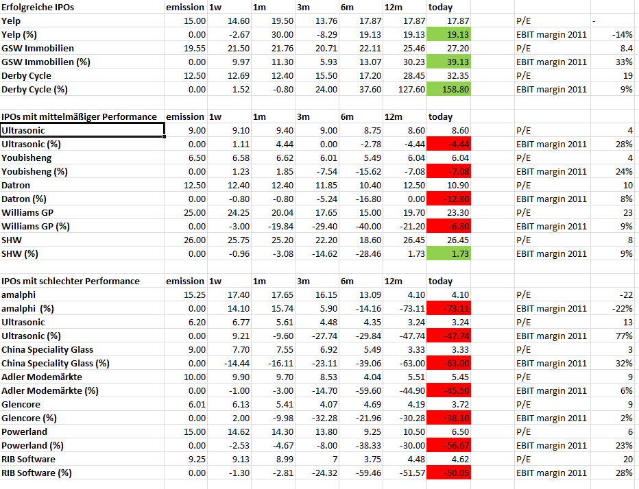 Finanzen.Net bietet eine schöne Übersicht von den letzten IPOs im Deutschen Markt. Es gab in 2011 / 2012 15 IPOs. Davon ist der bisherige Performance für 3 Aktien erfolgreich (+17% und mehr), für 5 mittelmäßig (zwischen -13% und +2%) und für 7 schlecht (alle -38% oder mehr). Hier eine Übersicht der Aktien: Es fällt auf, dass IPOs der Chinesischen Firmen (China Speciality Glass, Ultrasonic, Youbisheng) alle sehr hohe Margen haben, und trotzdem mit sehr niedrigen KGVs (3 bis 4) bewertet sind. Irgendwas stimmt da nicht, oder der Markt hat wenig Vertrauen in Chinesischen Firmen. Es gab einige IPOs die qua timing nicht der Hammer waren, so würde Datron ein Monat vor der Tsunami in Japan platziert, und SHW kurz vor dem Crash in August platziert. Diese beide Firmen habe zwar volle Auftragsbücher, aber die Prognosen für die Maschinenbau sind in den letzten Wochen runter gegangen. RIB Software hat große Ziele, sie wollen ihre Umsätze verzehnfachen, und in den Tecdax aufgenommen werden.. aber sie sind abhänging von der Baubranche, und die wird von einer schwachen Europäischen Wirtschaft nicht unbedingt profitieren. Fast alle Firmen schreiben schwarze Zahlen. Nur Amalphi und Yelp nicht. Letztere ist keine Deutsche Firma, aber in Frankfurt verhandelbar. Yelp ist interessant, denn wie bei der Lotto24 AG handelt es sich hier um eine IPO von einer Internetfirma. In kurzer Zeit hat die AKtie 30% zugelegt, aber ist dann in der Korrektur fast halbiert. Die Gewinnschätzungen liegen auch im nächsten Jahr noch nicht im Plus. Trotzdem hat die Aktie eine gute Performance. Was spielt da mit? Die Fantasie, dass der Kurs sich wie eine Google, Ebay, Yahoo oder hierzulande eine Bet-At-Home in die Höhe schießt. Bet-At-Home ist übrigens ein interessanter Vergleich, denn die Firma schaffte es von 2005 und 2006 Ihre Umsatzerlöse von 40 Mio Euro auf 334 Mio zu bringen. Das EBIT verfünfachte, und das Ergebnis ist von -218 TEUR auf 973 TEUR gegangen. Eine ähnliche Entwicklung wäre auch bei Lotto24 denkbar, sobald die Firma es schafft profitabel zu werden. Wenn der Online Lottovermittlung in Juli wirklich wieder erlaubt wird, das Börsenwetter dazu noch gut ist, dann könnte auch Lotto24 erstmal in die Höhe gehen. Man muss aber damit rechnen, dass bei negativem Börsenwetter, oder bei der nächsten Korrektur viele Leute ihre Gewinne (Dividende) mitnehmen werden. Der Albtraum wäre ein Kursverlauf von Linksoben nach Rechstunten. Das sollte aber nicht der Fall sein. Lotto24 hat ein sehr erfahrenes Management, eine wunderschöne gut laufende Webseite, und könnte eine sehr stetige positive Newsflow generieren, wenn es um die Erlaubnisse in den verschiedenen Bundesländer geht. Wichtig ist das die Anzahl der registrierten und aktiven Kunden ständig wächst. Hoffen wir mal, dass Europa bis Dienstag nächste Woche nicht untergeht. |