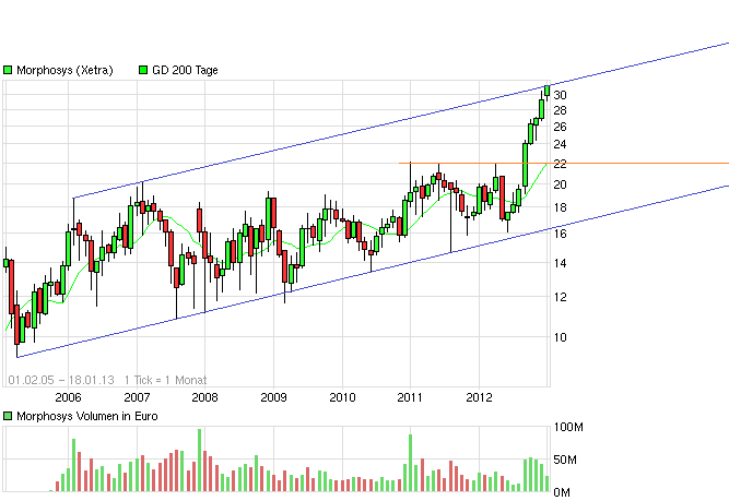 Davon befinden sich 21 bereits in der klinischen Prüfung. Für sein am weitesten fortgeschrittenes Antikörperprojekt Mor 103 zur Behandlung von rheumatoider Arthritis suchen die Bayern derzeit einen finanzstarken Pharmapartner. Sollte dieser schnell gefunden werden, könnte das zu einem weiteren Höhenflug der Aktie führen.