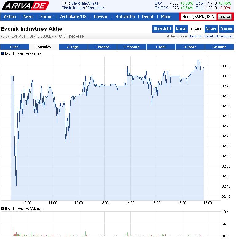 "Evonik, so erfolgreich wie der BVB? Ähnlich [gemeint: wie bei Lanxess] könnte der Weg auch für Evonik verlaufen, gilt doch auch dieses Unternehmen als gut geführt und ausgesprochen innovativ (z.B. Entwicklung und Herstellung von Lithium-Ionen-Akkus in einer gemeinsam mit Daimler geführten Tochtergesellschaft, der Li-Tec Battery GmbH). Wird also Evonik an der Börse so erfolgreich wie Dortmund im Fußball? Zählen wir einfach die Punkte zusammen.
