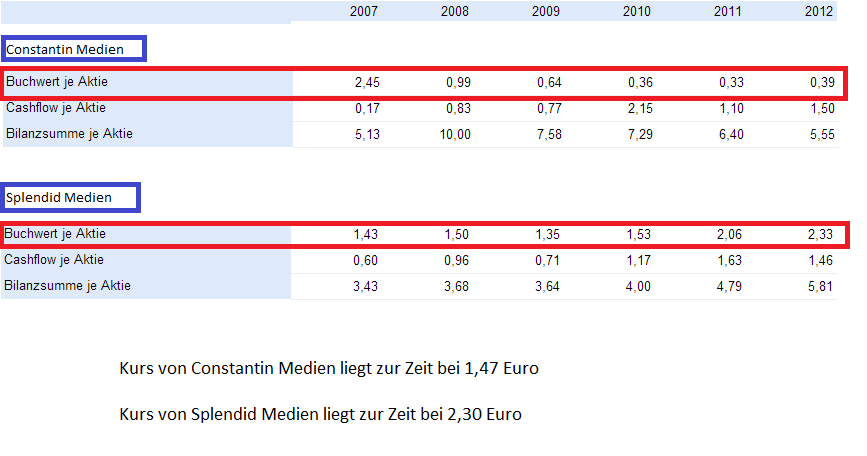 Also ich sehe da sogar Splendid wesentlich besser als Constantin. Natürlich fände ich ein KGV von gut 24 für Splendid auch für zu hoch wie für Constantin ebenso aber ein KGV von 10 fände ich fair und da läge man auf der Basis der 2012-Zahlen bei Splendid Medien schon bei einem Kurs von 3,70 Euro und nimmt man die Zukunft die an der Börse gehandelt wird müßte der Kurs locker die 4 Euro hinter sich gelassen haben.