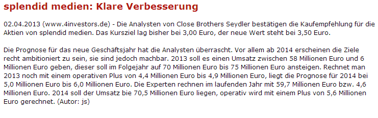 So und jetzt sollte man sich die letzten Jahre und die Prognosen für 2013 mal vor Augen halten. Splendid Medien gibt für 2013 eine Steigerung des Umsatzes und Gewinn aus und beo Constantin Film macht man genau das Gegenteil von dem.