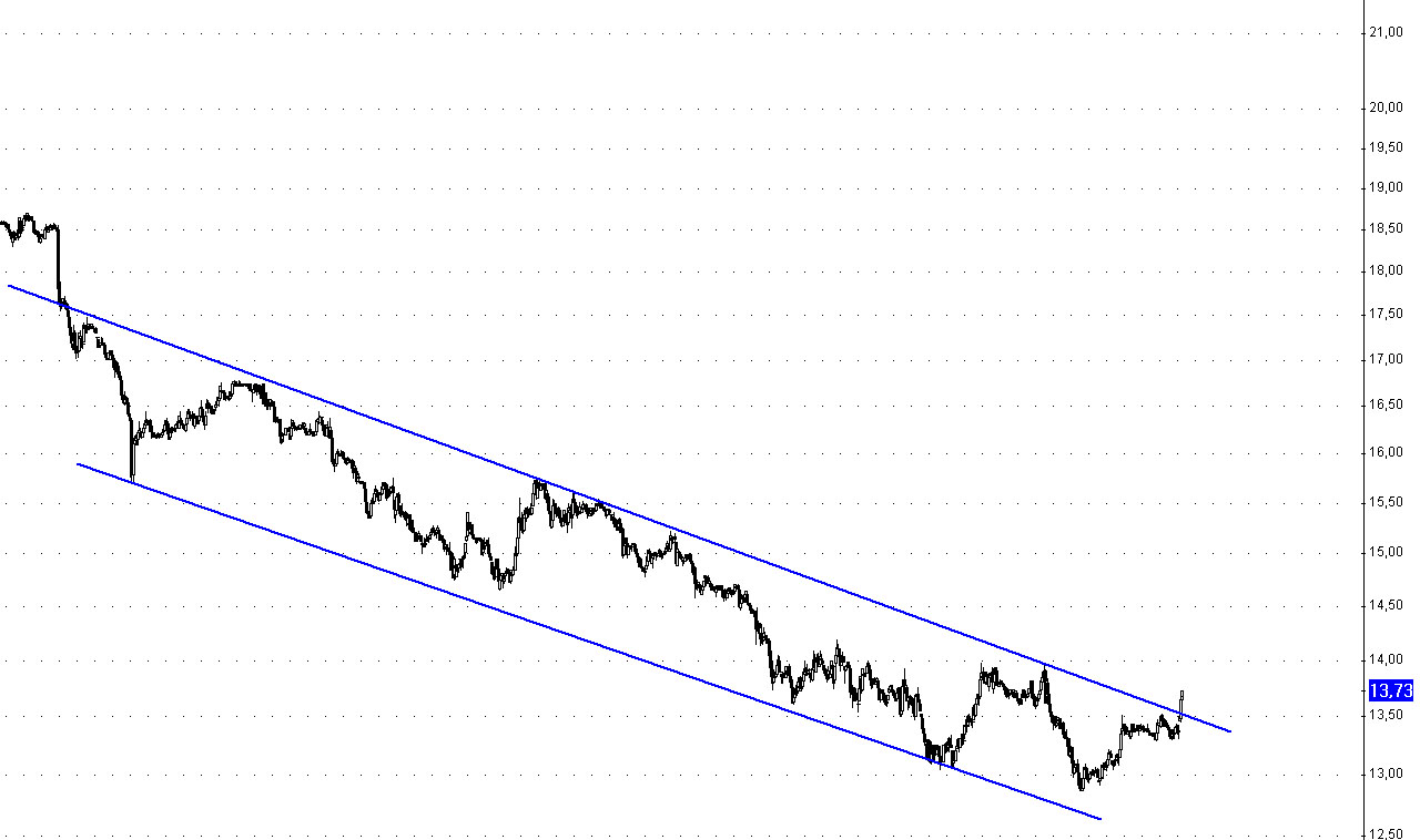 Nach Überwinden des 1. Kurzfrist-Ziels bei 14,-...14,20 Euro sehe ich den Break der FW bestätigt und gehe gehebelt long. Aber bitte nicht falsch interpetieren: ich rede hier von einem Trade, mit der Langfristanlage hat das (noch) nichts zu tun. Die kommt aber noch - nach Abschluss der Bodenbildung (s.a. Gerah #9).