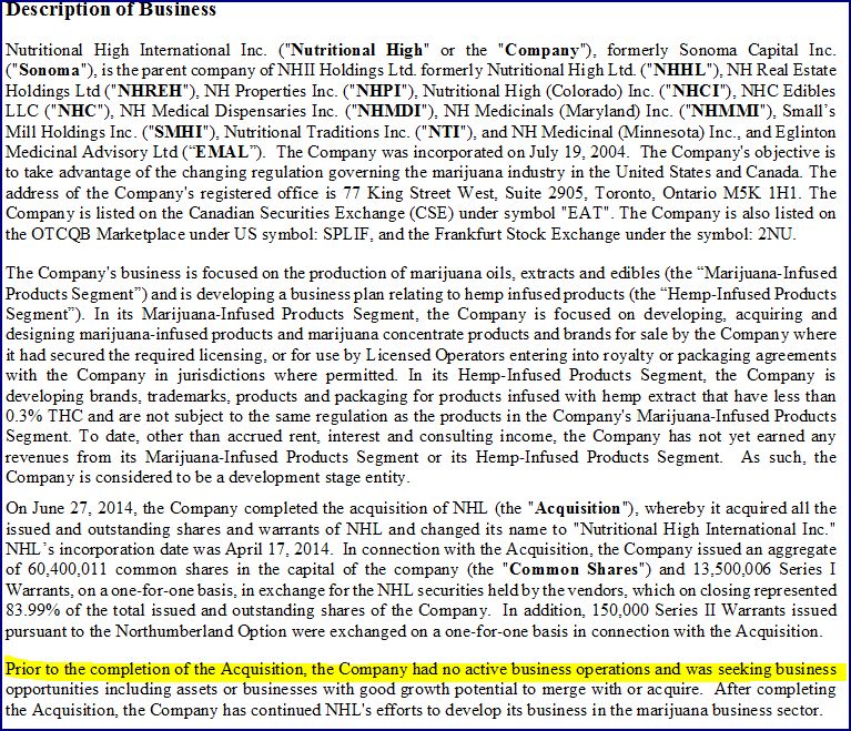 Nutritional High konzentriert sich auf die Entwicklung, die Herstellung und den Vertrieb von Produkten und landesweit anerkannten Marken der Branchen für Hanf- und Marihuanaprodukte, einschließlich Nahrungsmittel und Ölextrakte zur alimentären und medizinischen Anwendung bzw. als Genussmittel für Erwachsene. Das Unternehmen ist ausschließlich über lizenzierte Einrichtungen in Rechtsstaaten tätig, in denen solche Aktivitäten genehmigt und per Gesetz reguliert werden.