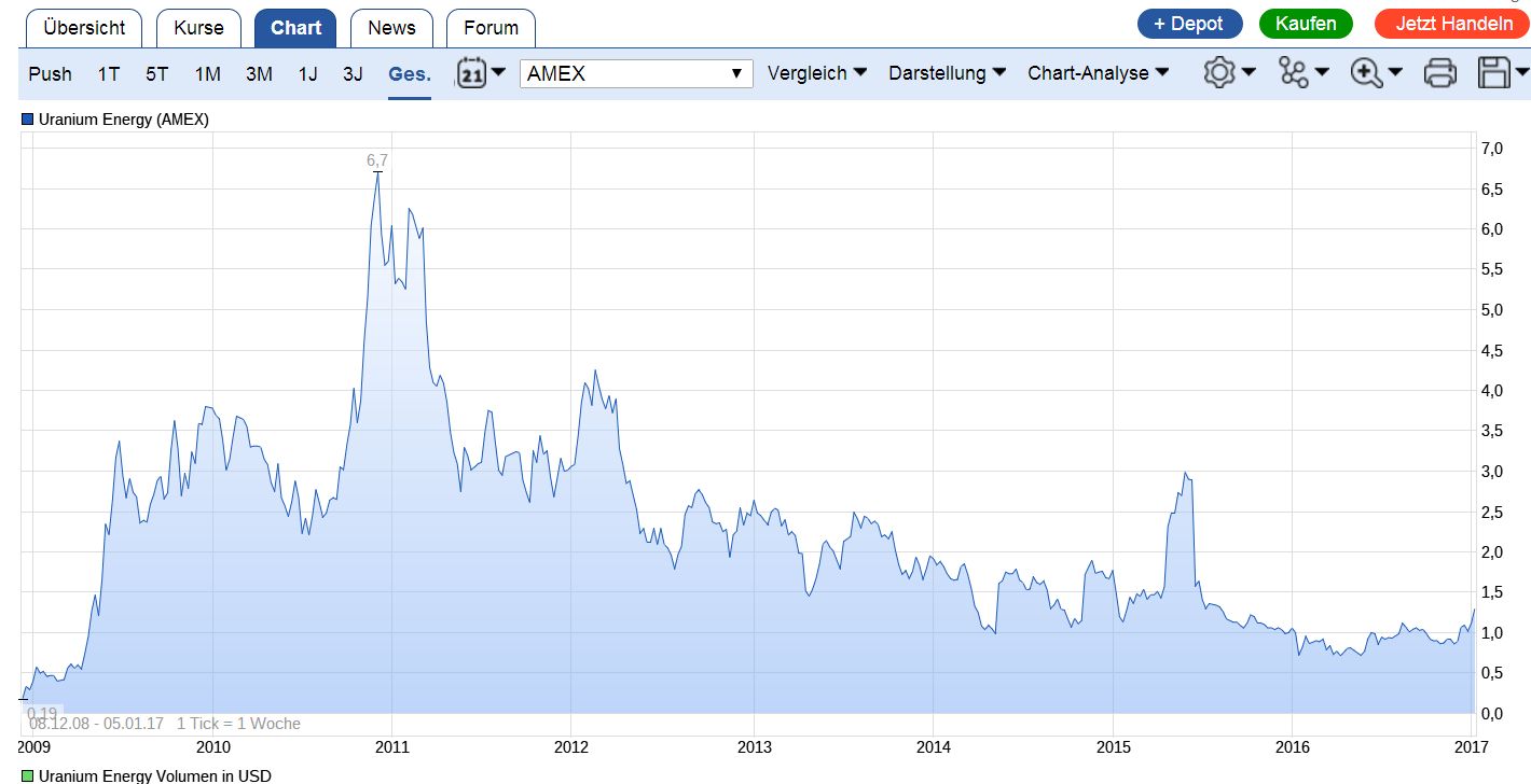 Weniger durch Trump sondern weil kein Produzent mehr einen Gewinn macht bei unter 22 € Uranpreis ! ....derzeit bauen die Chinesen im Durchschnitt alle 2 Monate einen Reaktor ! Ca. 80 neue Reaktoren sollen bis 2030 ans Netz gebracht werden da China weg will von den ganzen Luftverpestenden Kohlekraftwerken. Dort erkranken immer mehr Menschen...Lungenkrankheiten explodieren...immer mehr bekommen Allergien, Krebs. Auch um die Klimaziele einzuhalten müßen die weg von der Kohle und mehr in EG und Atomenergie investieren. Deshalb haben die Funktionäre in Peking den massiven Ausbau der Kernenergie angekündigt....das dies nicht nur leere Worte in 2015 waren, kann man heute in ganz China verfolgen. Derzeit sind dort 21 Reaktoren im Bau ! Dann sollen bis Ende März dieses Jahres in Japan ganze 7 Reaktornen wieder hochgefahren werden....bis Ende 2018 weitere 30 ! In Japan wurden 2011/12 nach dem Fukushima Tsunami ganze 50 Reaktoren vom Netz genommen. Fast alle sollen wieder ans Netz ! Die paar AKWs die in den nächsten Jahren auf der Welt abgeschaltet werden ,stehen zu keinem Verhältniss zu dem was neu gebaut wird und erst Recht nicht was in Planung ist. China, Indien ....über 2,5 Milliarden Menschen, stark wachsend...die hungrig nach Technik..Strom sind ! Auch Saudi Arabien, Iran, Türkei, Südkorea etc. setzen alle auf Atomstrom. USA sowieso. Nur Idiotschland tanzt mal wieder aus der Reihe...dabei haben wir ein Steinwurf entfern an der franz. Grenze etliche alte Meiler stehn die noch bis 2040 laufen sollen...tzz