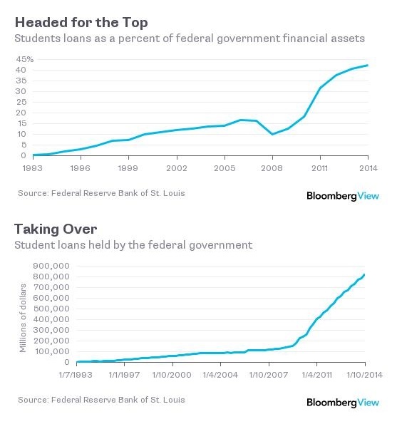 Wie dem Chart unten zu entnehmen, eine sehr aggressive Vergabe der Staatskredite an Studenten begann mit Obama-Administration im Jahre 2008, welche unumgaenglich die Gebuehren fuer die Ausbildungsschulen noch weiter in die Hoehe getrieben haben. Ein zusaetzlicher Nebeneffekt ist die negative Auswirkung auf das Verhaeltnis der Vermoegenswerte des Staates, welche einen sehr hohen Prozentanteil (fast 45%) aus Studentenkrediten bestehen. Das Risiko besteht insofern darin, dass wenn die Kredite nicht zurueckbezahlt werden koennen (z.B. schlechter Arbeitsmarkt), das unumgaenglich ein sehr grosses Problem fuer USA zur Folge haben wird, da u.U. Geldausborgen fuer USA teuerer wird. Ebenso von Bedeutung waere zu erwaehnen, dass fuer diese Kredite zur Zeit kein Privatkonkurs angemeldet werden kann.