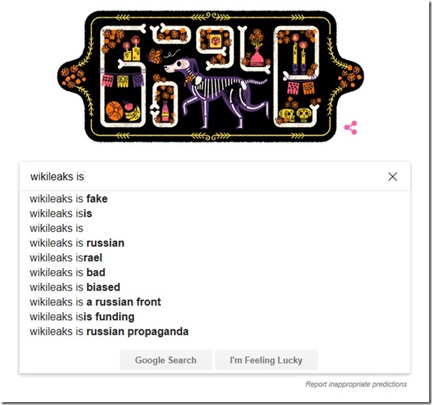 Ebenso hat man sich in den letzten Jahren immer gewundert, warum Obama nicht mehr "Frohe Ostern" oder "Frohe Weihnachten" bei Fernsehauftritte gesagt hat sowie auch, dass Google in der Obama-Aera aufgehoert hat illustrative Widmungen fuer christliche Ereignisse/Feiertage (z.B. Ostern, usw.) auf der Startseite abzubilden, vergleichsweise aber zu allen moeglichen schwachsinnigen Themen (hier alle Abbildungen), darunter z.B. gestern siehe unten "Tag des Todes" (es ist NICHT Halloween, das war 2 Tage davor). Ebenso interessant ist, wie bestimmte Suchbegriffe generiert werden (WikiLeaks hat seit 11 Jahren NIE falsche Informationen veroeffentlicht, siehe aber die Suchvorschlaege unten).
