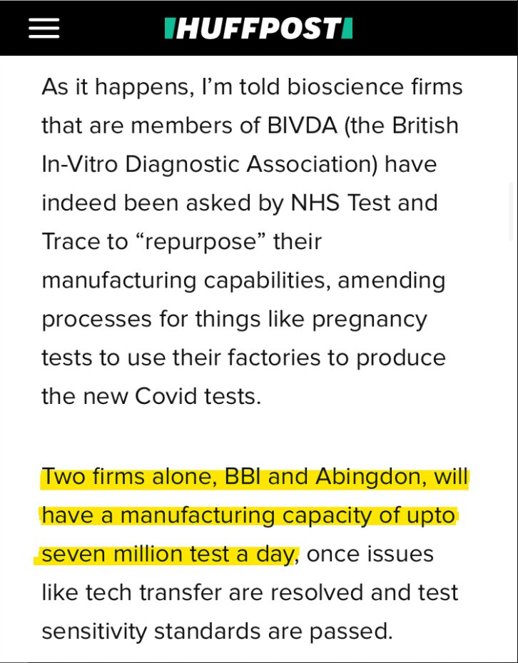 UK hat erklärt, dass sie 10 Millionen Tests pro Tag wollen. Dies wird seit Oktober diskutiert aber der letzte Stand ist, dass sie dieses Ziel bis April erreichen wollen (75 Millionen pro Woche = 10,7 Millionen pro Tag):