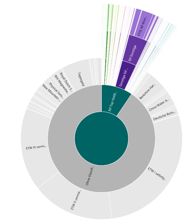 Tatsächlich mache ich mir die Mühe, jeden ETF bzw. Fonds auch in dieser Hinsicht zu klassifizieren und das weit über seine Top 10 Holdings hinaus. Wie man sieht, schälen sich dabei erst jetzt bestimmte Werte hervor. Zugleich macht „Sonstige“ immer noch über 30% dessen aus, was in ETFs und Fonds so verborgen ist.
