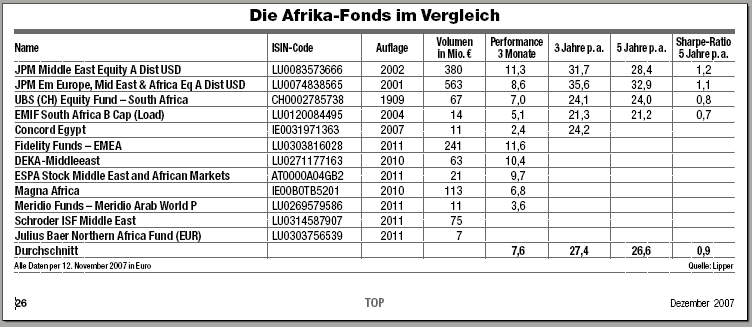 1. Für den Anteil, der auf afrikanische Aktien setzt, wird eine „zusätzliche Gebühr von 1,25%“ (Zitat aus dem Verkaufsprospekt) fällig.
