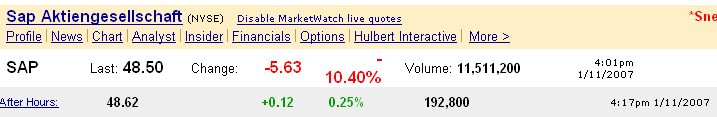 Die in den USA notierten Hinterlegungsscheine für SAP-Aktien verloren 10,4 Prozent auf 48,50 Dollar (rund 37,60 Euro). In Frankfurt war die Aktie des Unternehmens, das mit einer Marktkapitalisierung von mehr als 50 Milliarden Euro zu den teuersten Deutschlands gehört, in Erwartung positiver Quartalszahlen um knapp zwei Prozent auf 42,27 Euro geklettert. Bereits am Dienstag war die Aktie wegen der Spekulation auf eine positive Überraschung bei den Quartalszahlen auf den höchsten Stand seit Mai 2006 geklettert. Das Papier entwickelte sich seit der Bekanntgabe der Neunmonatszahlen im Oktober deutlich schlechter als der DAX .