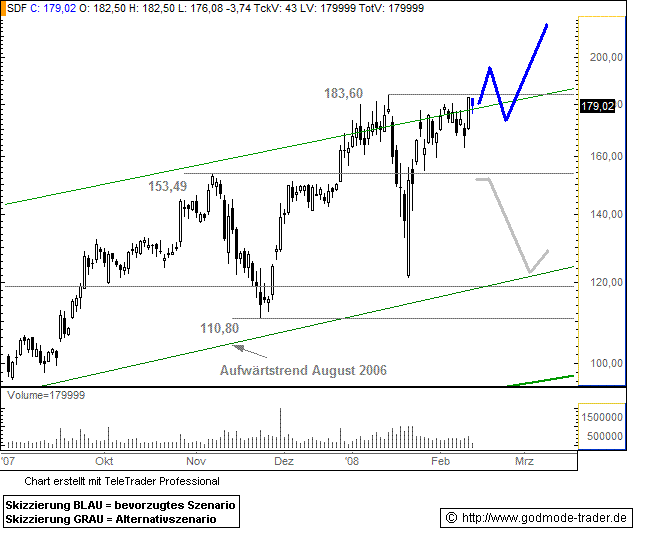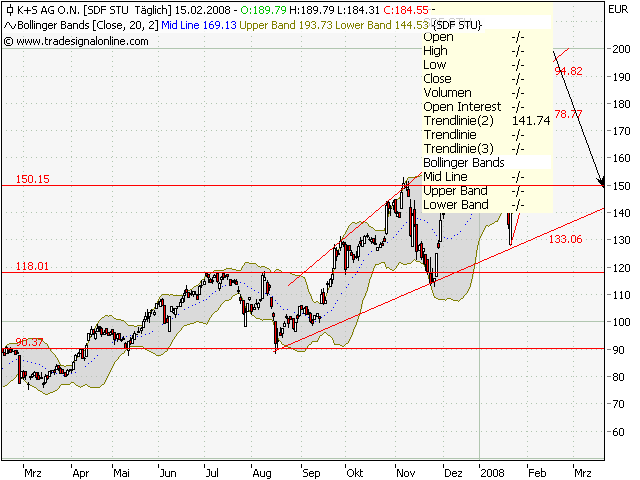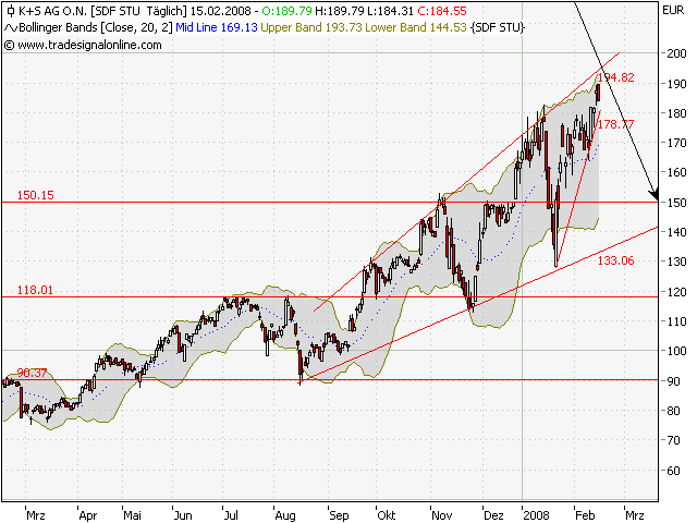 K+S - Starker Chart...Datum 13.02.2008 - Uhrzeit 12:30 (© BörseGo AG 2007, Autor: Berteit Rene, Technischer Analyst, © GodmodeTrader - http://www.godmode-trader.de/) WKN: 716200 | ISIN: DE0007162000 | Intradaykurs: K+S - WKN: 716200 - ISIN: DE0007162000