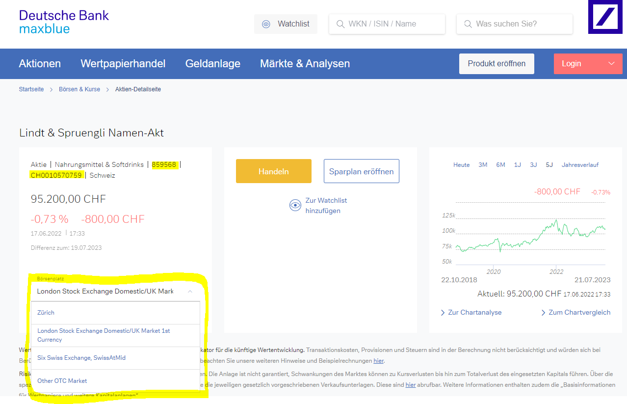 Eigentlich bevorzuge ich ja Direktinvestments. Aber bei Schweizer Aktien geht es schon mit der Handelbarkeit und den dadurch ausgelösten Kosten los (vgl. Link im Beitrag #33, er führt zu einem separaten Thread diesbezüglich) und setzt sich dann mit Themen wie Schweizer Quellensteuer fort. Hinzu kommt der hohe Kurs pro Aktie - was für Privatanleger wie mich dann doch ein enormes Klumpenrisiko bedeutet (Multimillionäre oder gar -däre mögen das anders sehen - geschenkt und laßt Euch von meinem Usernamen nicht täuschen diesbezüglich). Sparplanfähig ist Lindt & Sprüngli zumindest bei meinen Brokern auch nicht.