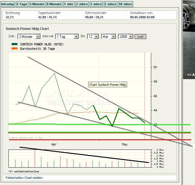 | In den nächsten zwei bis drei Tagen werden wir schlauer sein. Ich vermute, dass es sich bei der derzeitigen Chartformation der letzten Wochen um einen Keil handelt. Dafür müsste es aber bald zum Ausbruch kommen, sonst wird aus dem Keil eben doch ein waschechter Abwärtstrend. Gut ist auf jeden Fall aber schonmal, dass es bei weitem nicht so steil runter- wie es vorher seit Mitte März rauf ging. Das ist zunächst ein gutes Zeichen. Ebenfalls gut ist, dass das Volumen in dieser Zeit eher abgenommen hat. Entscheidend wird sein, ob wir heute und morgen über der Unterstützung bei 42 schließen (grauer Balken), ob wir es über den Widerstand bei 42,50 schaffen (kurzer grauer Balken) oder ob der Kurs eine ähnliche Abwärtsdynamik hinlegt wie in den letzten Tagen ODER ob er diese sogar verstärkt. Die "Untertasse" von Freitag war schonmal ein ganz gutes Zeichen, jetzt müssen wir eben schauen, was morgen und übermorgen passiert! |