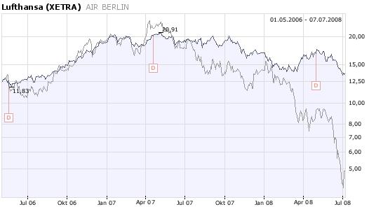 Warum verlieren dann alle Fluggesellschaften so stark im Kurs ?! Air Berlin sichert lt. diverser Auskünfte auch die Preise ab (88% sind gesichert), trotzdem ist die Aktie in ein tiefes tiefes Loch gefallen. Mir ist durchaus bewusst, das Air Berlin noch andere Probleme hat ( Verschuldung, Integration LTU/DBA, Konkurrenzdruck etc.), trotzdem sind die Kursrückgänge schon enorm. Air France KLM oder andere Gesellschaften fallen in den Kursen auch sehr stark.