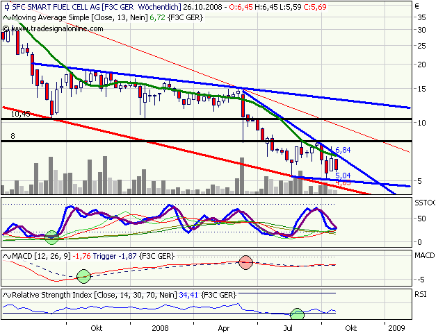 Unter 6 € sind jedenfalls immer absolute Ausverkaufstage, denn da notiert man nunmal mehr als 10% unter Nettocash. Ob man über die 8,1 € ausbrechen kann, hängt sicherlich davon ab, ob man aus einer der vielen Auszeichnungen für die Technologie auch noch nen Großauftrag erwächst, wie z.B. durch die US-Armee. Das ist aber nicht gerade unwahrscheinlich. Geht nur darum, wann die Aufträge reinflattern. Ist für mich ne Anlage für oder gegen die Abgeltungssteuer. Werd SFC wohl über das Jahr 2009 hinaus halten.