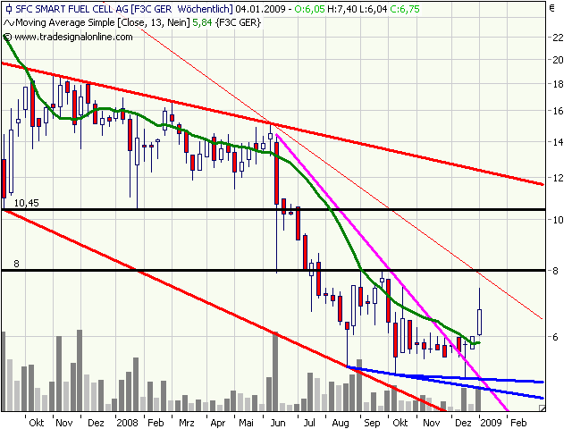 Bei SFC läufts nach meinen Infos wie geplant. Ein wenig Cashabfluss dürfte man noch haben, aber man dürfte auch 2009 noch über 6 € pro Aktie Cash auf dem Konto haben, und dann stehen die Jahre bevor, wo der Brennstoffzelle hohes Potenzial zugesprochen wird.