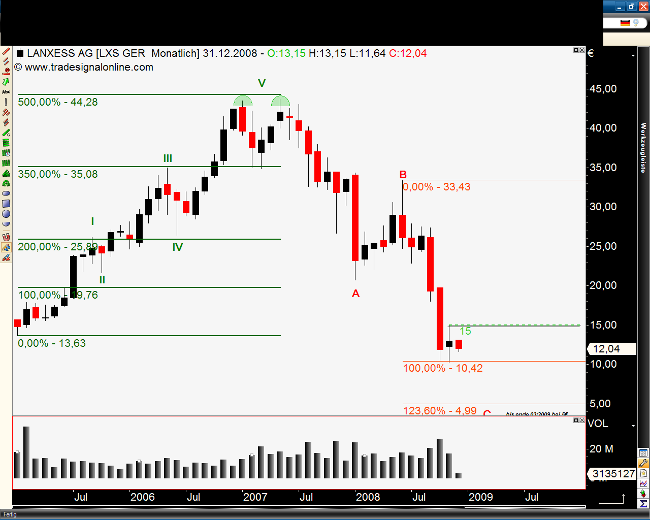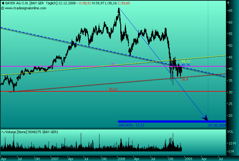 ich beschäftige mich seit längerem ziemlich intensiv mit dem Bayer-Wert und habe mich mal an eine charttechnische Analyse gewagt.