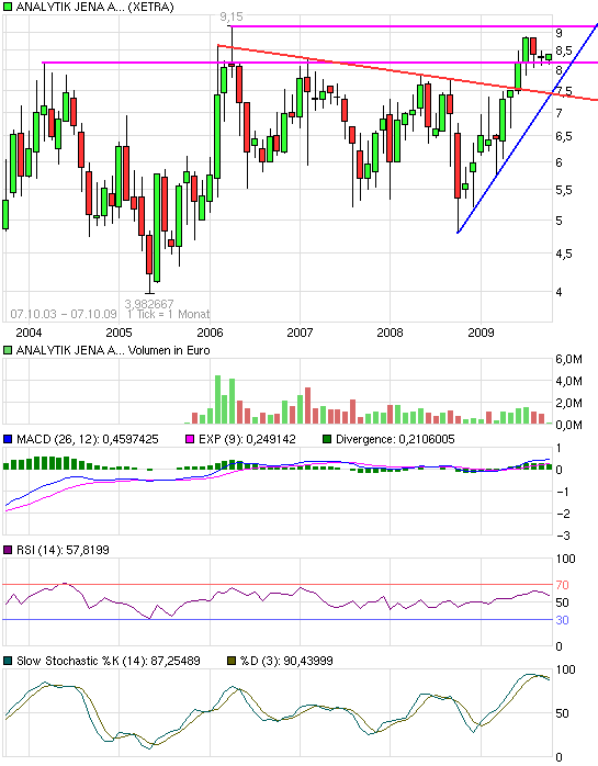 Nächstes Jahr (2010/11) unterstelle ich 17 Mio € zusätzlichen Umsatz, was knapp 18% Wachstum bedeutet. Natürlich beinhaltet das die Annahme, dass erstens die weltwirtschaftliche Lage sich zumindest stabilisiert, und es beinhaltet weiteres anorganisches Wachstum. 12% organisches Wachstum sollte für AJA durch die Produktpalette, die gestiegenen Fertigunskapazitäten, das Synergiepotenzial bei Cybio (Vertrieb), das asiatische Nachholpotenzial und die allgemeinen Zukunftschancen der Branche möglich sein. Von den 17 Mio € werden also 11 Mio € durch organisches Wachstum abgedeckt. Die verbleibenen 6 Mio € unterstelle ich durch anorganisches Wachstum. In 3 Jahren ist Analytik Jena dann bereits ein ziemlich gut finanziell ausgestatteter Konzern, da man bei 12 Mio € Ebit wohl davon ausgehen kann, dass der operative Cashflow in ähnlicher Größenordnung liegen wird. Ich halte aus dem Grunde anorganisches Wachstum in der Folge (2011/12) für durchaus wahrscheinlich, und das erklärt den Sprung von 23 Mio € in 3 Jahren. Auch dort sind das allerdings prozentual gesehen nur 20%. Auch dort hab ich organisch mit 12% Wachstum kalkuliert und die verbleibenen 8-9 Mio € wären auf anorganisches Wachstum zurückzuführen. Übrigens glaube ich dann vor allen an diese Zukäufe eher im Ausland.