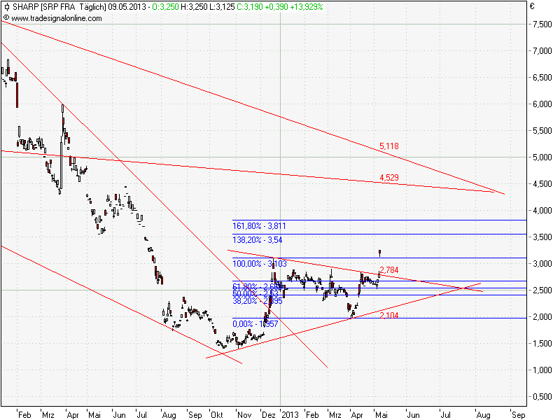 Eine Investition in die Aktie von Sharp ist kein Selbstläufer. Als Anleger braucht man wahrscheinlich gute Nerven. Kurssprünge im zweistelligen Bereich können vorkommen. Nach der starken V-Umkehr hat sich eine bullische Flagge ausgebildet, deren Auflösung zum Erreichen des ersten markanten Widerstandes führen sollte. Dieser liegt bei 4,20 Euro. Wird dieser Bereich überwunden, sind Kurse von 7 und später 10 Euro möglich. Die Chancen sind also gigantisch. Voraussetzung ist natürlich, dass Sharp nicht in die Pleite geht. Betrachtet man den Verlust 2012, dann kann man daran schon zweifeln. Es sieht aber schlimmer aus als es ist. Der operative Verlust ist weniger negativ als der operative Verlust 2009. Dass der Nettoverlust so viel höher ist als vor 3 Jahren liegt an außergewöhnlichen Belastungen, die auf die Restrukturierung zurückzuführen sind. Desinvestition, Abschreibungen, Abfindungen etc. haben zu Sonderbelastungen von über 300 Milliarden Yen und einem Nettoverlust von 350 Milliarden Yen geführt (ca. 3 Milliarden Euro). Ein Großteil des Schmerzes ist damit vorbei. Es ist zudem ermunternd, dass nach der großen Absatzschwäche die Verkaufszahlen wieder anspringen. Nicht zuletzt die Unterhaltungselektronik, die noch 40% des Umsatzes ausmacht, konnte sich stabilisieren. Sharp verlässt sich allerdings nicht darauf, dass alles wieder einfach so gut wird. Es wird kräftig umgebaut, auch um vom Heimatmarkt weniger abhängig zu werden. Der Umsatzanteil liegt hier bei über 60%. Innerhalb weniger Jahre will Sharp den Anteil auf 40% durch Wachstum im Ausland verringern. Bereits 20% kommen aus China. Sollte es nicht zu unerwartet heftigen politischen Auseinandersetzungen zwischen China und Japan kommen, kann die Expansion funktionieren. Zudem werden neue Sparten aufgebaut bzw. erweitert. Dazu gehören intelligente Kommunikationsnetzwerke, erneuerbare Energie und Gesundheitswesen. Die Chancen stehen gut, dass Sharp nicht in die Insolvenz gehen muss. Riskant ist das Investment natürlich dennoch und sollte nur in Zusammenhang gesehen werden. Als alleinstehendes Investment mit hohem Anteil am Depot taugt Sharp nicht. Bis sich der mögliche Turnaround in den Zahlen zeigt, kann noch eine ganze Weile vergehen. Bis dahin wird der Aktienkurs stark von kurzfristigen Meldungen abhängen. Haupttreiber ist derzeit die Cashposition. Vor allem davon wird abhängen, ob Sharp weiter alleine existieren kann. Nach eigenen Angaben will das Unternehmen notfalls auch einen Zusammenschluss mit anderen Firmen evaluieren. Solche Gerüchte treiben den Kurs erheblich. Zuletzt konnte die Aktie aufgrund eines solchen Gerüchts 10% an einem Tag zulegen. Ebenso wie kürzlich noch Nokia liegt Sharp so weit am Boden, dass die meisten Nachrichten positiv aufgenommen werden. |