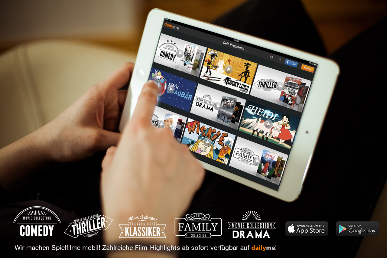 Mit der neuen „Movie Collection“ nun ist bei dailyme TV für jeden Filmfreund etwas dabei: Egal, ob Comedy, Thriller, Drama, Familienfilme oder der französische Klassiker – die Auswahl an Spielfilmen ist groß. Die einzelnen Genres sind in der App jeweils in Film-Paketen zusammengefasst. Wöchentlich wird so pro Genre ein neuer Spielfilm auf das Gerät des Nutzers geladen. Zudem steuert FilmConfect ab sofort noch Zeichentrick-Klassiker, wie Wickie, Heidi, Lucky Luke oder Käpt’n Blaubär, zum Repertoire der TV-App bei, welche das umfangreiche Angebot perfekt abrunden.