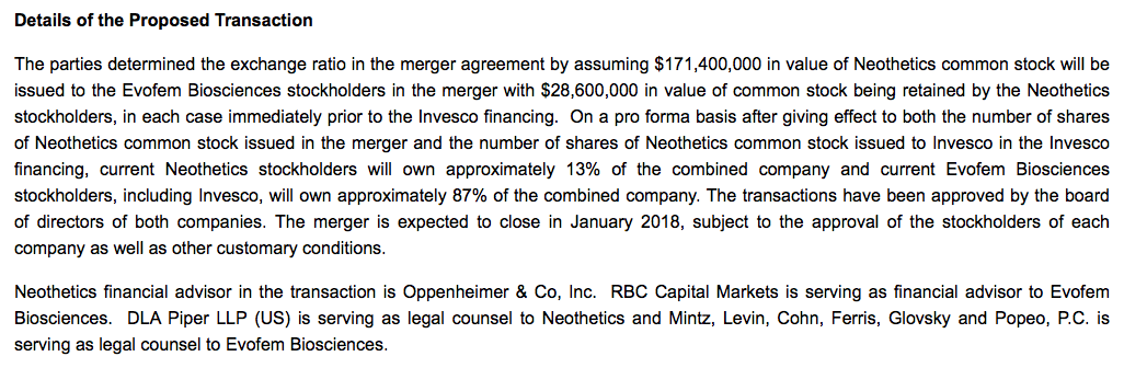 “Following an extensive and thorough review of strategic alternatives, we believe the proposed merger with Evofem Biosciences provides the best opportunity to maximize value for Neothetics’ shareholders,” said Martha Demski, a member of Neothetics Strategic Transaction Committee and Board of Directors.  “We believe the strength of the leadership team, coupled with the completion of its pregnancy prevention trial, will enable Amphora® to reach significant value inflection points in the near term.”