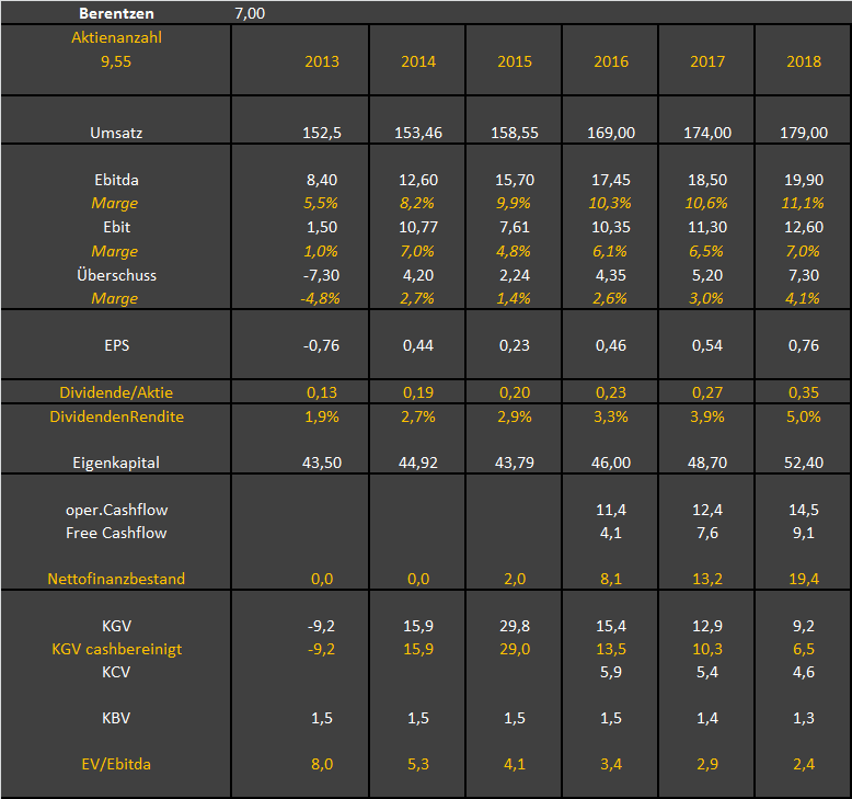Vakant ist natürlich letztlich der Umsatz. Da rechne ich mit 3% Anstieg pro Jahr. Aber selbst wenn das nicht eintritt und der Umsatz bis 2018 nur stagnieren würde, wäre man aufgrund der Zinseinsparungen aus meiner Sicht ein Kauf. Die operativen Gewinne und Cashflows sollten für 2017/18 Dividendenrenditen von 4-5% zulassen. Falls der Vorstand nicht anorganisch wächst, wäre sogar irgendwann mal eine Sonderdividende denkbar. Das geringe EV/Ebitda von 2,4 für 2018 (meine Schätzung bei wie gesagt 3% Umsatzwachstum) ist für die Dividendenhöhe immer ein ganz guter Indikator.