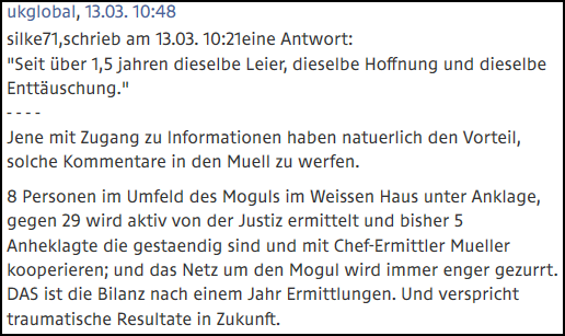 Der privilegierte ORF-Jünger ukglobal, welcher dort sehr auffällig seit geräumter Zeit die übereinstimmenden "Bashen"-Botschaften des ORFs analog propagiert - zwar auf seiner Art ("Mogul", "Dotard Trump", "entlarvt sich der Idiot taeglich auf Twitter"), kommt offensichtlich übermäßig in den privilegierten Genuss der Sonderstellung.
