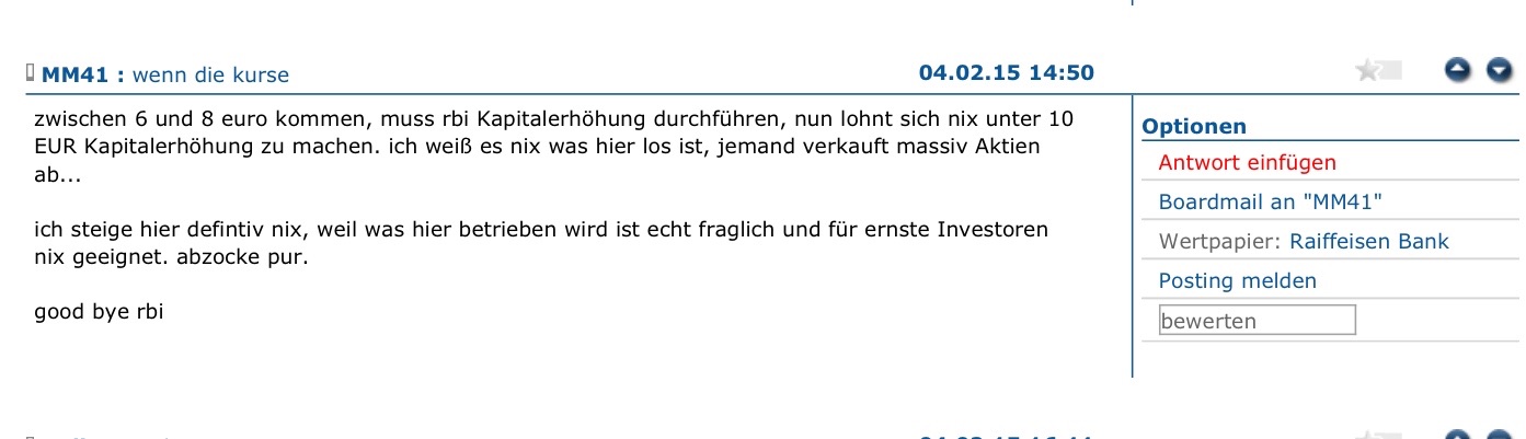egal wo überall rbi Geschäfte betreibt, überall sind viele krise entstanden dass nur noch pleite die lösung ist. ukraine, Russland, Albanien, polland, Slowenien, Kroatien, Serbien, bosnien...etc...alle diese Staaten sind bankrott, hohe arbeotslosigkeit, hohe schulden, wirtschaft kaputt... Ungarn ist ein guter Beispiel was kommt. RZB Muttergesellschaft muss sich dringend von seine Anteile in rbi trennen und das kommt da bin mir ziemlich sicher.
