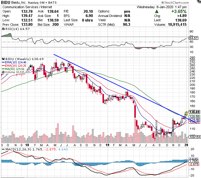 Der Aktienkurs von Baidu beeindruckt zu Jahresbeginn mit großer Stärke: Seit Jahresbeginn sind die Notierungen um 11,5 Prozent gestiegen. Damit hat der Kursverlauf seine Seitwärtsbewegung von Ende vergangenen Jahres beendet und schwenkt nun in einen potenziell starken Aufwärtstrend ein. Kritisch ist zu bewerten, dass sich die Kurse nach dem jüngsten Höhenflug bereits etwas heiß gelaufen haben; darauf deutet der prozentuale Abstand zwischen 200-Tagelinie (blaue Kurve) und Aktienkurs hin. Dieser Abstand beträgt derzeit ambitionierte 20 Prozent und zeugt damit, rückblickend betrachtet, von einer überkauften Marktsituation. Eile mit Weile, so unser Leitgedanke. Eine Konsolidierung in Form einer Seitwärtsbewegung würde uns nicht ängstigen, sondern würde mit dazu beitragen, die bestehende Kursüberhitzung zu neutralisieren. Für eine Kursberuhigung würde sich die Marke um 155,28 US-Dollar anbieten - diese ist als Widerstand zu sehen. Solange die 200-Tagelinie fällt, solange besteht nach wie vor die Gefahr von Rückschlägen. Positiv aber ist, dass die Notierungen seit Ende vergangenen Jahres wieder oberhalb ihrer Durchschnittslinie verlaufen - das erste Mal seit August 2018. Die Trendwende nach oben ist also eingeläutet - und das Aufwärtspotenzial enorm. Würde der Break out über 155,28 US-Dollar gelingen, so sähen wir langfristig für die Baidu-Aktie Preise um 200 US-Dollar. Baidu ist ein chinesisches Unternehmen, welches die gleichnamige Suchmaschine betreibt. Dabei gilt baidu.com als eine der weltweit am häufigsten aufgerufenen Webseiten. (s. Chart)