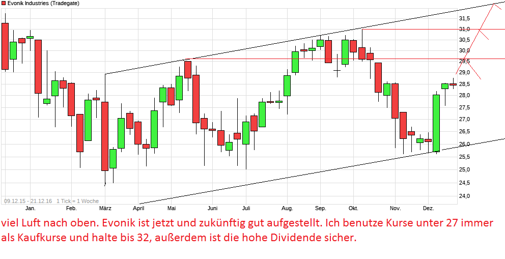 Der Kurs bei Evonik liegt am Methionin, DSM hat ja auch einen Knick bekommen, davon wird es sich erholen. Dennoch in den letzten Jahren hat sich Evoniks Kurs mehr als schlecht entwickelt. Lahmes Management, bekam es einfach nicht hin von dem Aufschwung im Chemiesektor groß zu profieren. Mal war Überproduktion beim Gummi für Reifen, nun das Gleiche bei Methionin, was auch den Kurs wieder lang begleiten wird.