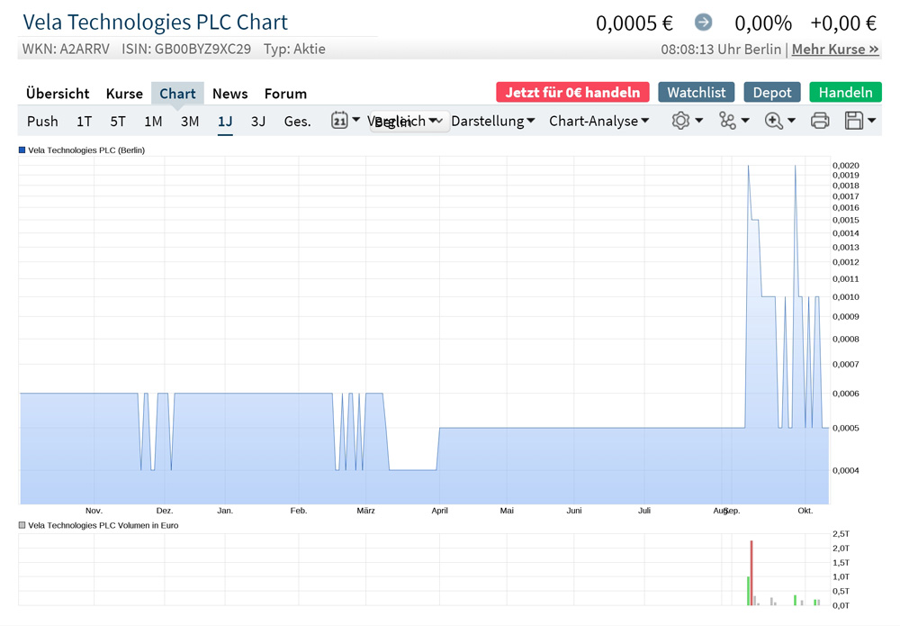 ...redet sich den Kurs schön! Aktuell bei 0,0005 Cent und nicht 0,001 bzw. 0,003 Cent! Der 1 Jahres-Chart zeigt, wann Vela das letzte mal bei 0,003 Cent stand! Also ich sehe nichts von 3 Cent... Das soll ehrbar sein? Unter dem Chart seht Ihr die Umsätze, welche so gut wie nicht vorhanden sind und die paar wenigen sind lächerlich. So sieht das in Deutschland aus. Deshalb, wer hier kauft, bekommt sie nie wieder los. Und warum Maydorn das Ding hier so anpreist, könnt Ihr Euch alle selber denken...