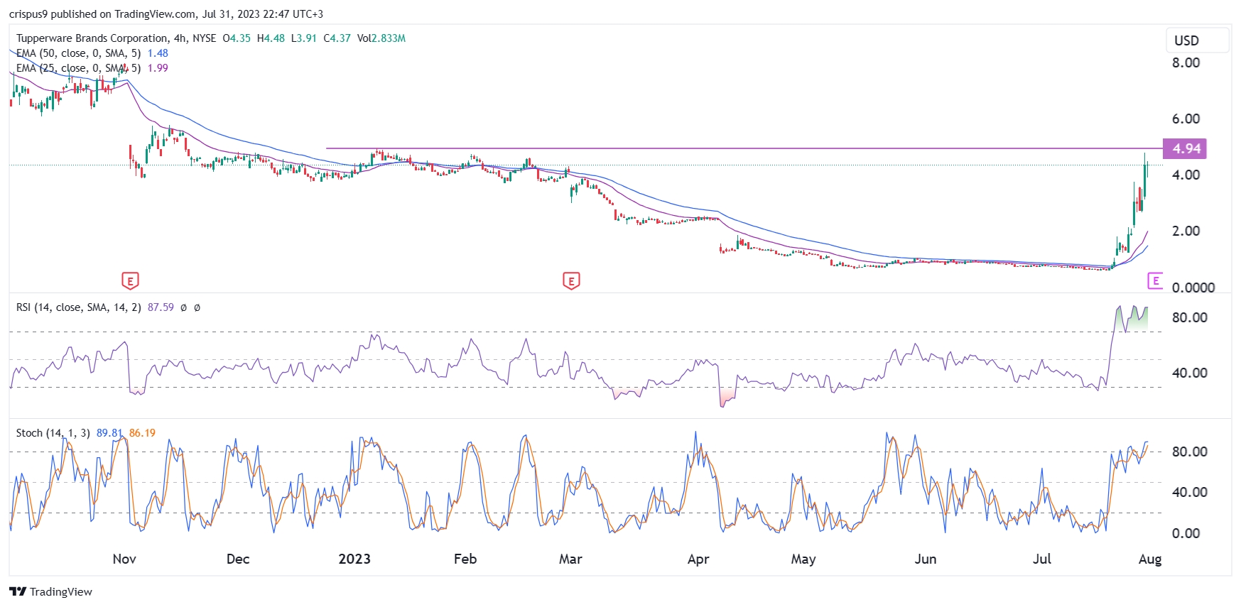 Der 4H-Chart zeigt, dass der TUP-Aktienkurs in den letzten Wochen ein spektakuläres Comeback hingelegt hat. Dabei ist es den Aktien gelungen, über die gleitenden 50-Tage- und 25-Tage-Durchschnitte zu klettern.