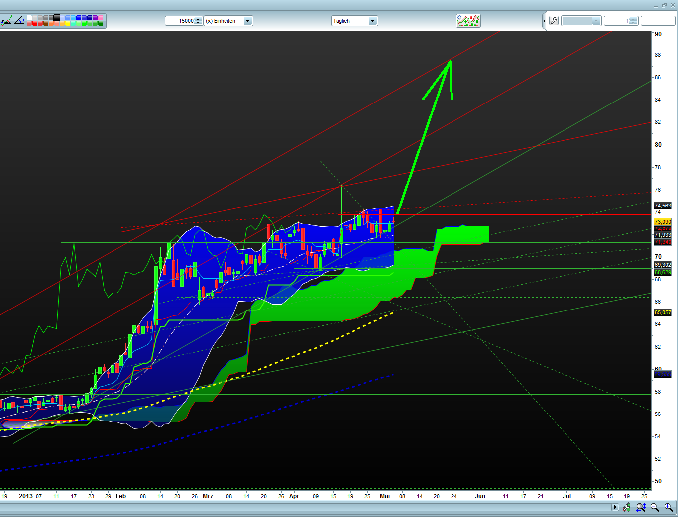 Warum? 1. Durch das genehmigte Vectoring Verfahren VDSL2 der Telekom, entsteht eine neue Konkurrenzsituation für Kabel Deutschland. 2. Durch die Zusammenarbeit der Telekom mit Vodafone im Bereich VDSL2 und Nutzung der neuen Bandbreiten, ist die Übernahmefantasie bei Kabel Deutschland quasi über Nacht dahin. Meinung Meinung nach ist Kursanstieg seit Jahresbeginn, überwiegend auf die Übernahmespekulationen durch Vodafone zurückzuführen. Das aber jetzt Vodafone Milliarden in VDSL2 Breitband investiert, werden sie wohl jetzt kaum noch einen Kabelnetzbetreiber übernehmen. Mein KZ bis Ende Juni: 62-65€. |
