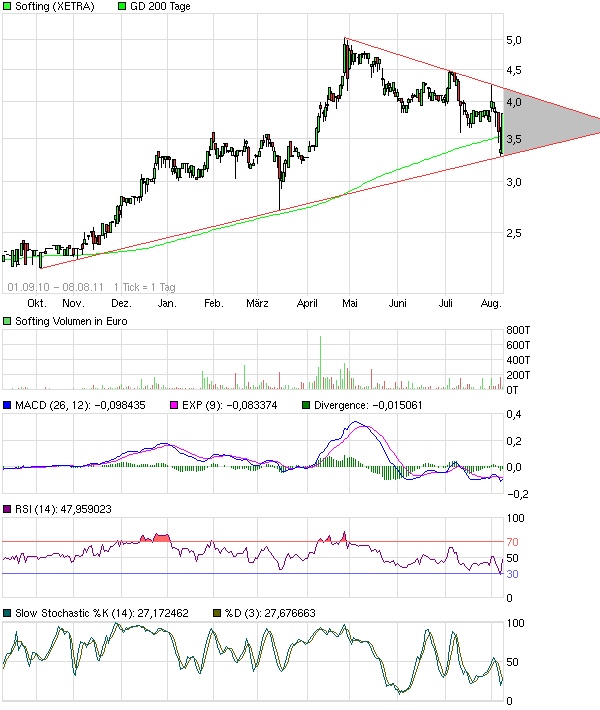 Die Erfahrung zeigt aber, dass selbst solch gute Aussichten in einem Markt der Unsicherheiten vollständig verpuffen. Die Leute wollen raus aus Aktien und dem wird sich Softing auch trotz sehr guter Zahlen nicht entziehen können. Vor daher drohen in den nächsten Wochen sogar Kurse unterhalb von 3 EUR. Ist aber auch egal, da ich unter 3,2 weiter zukaufen werde. Man darf nicht vergessen, dass Softing mit zwei Übernahmen schnell den Umsatz 2012 auf 60 bis 70 Mill. steigern kann. KUV läge dann bei 0,3 aber dies macht sich hier keiner klar.