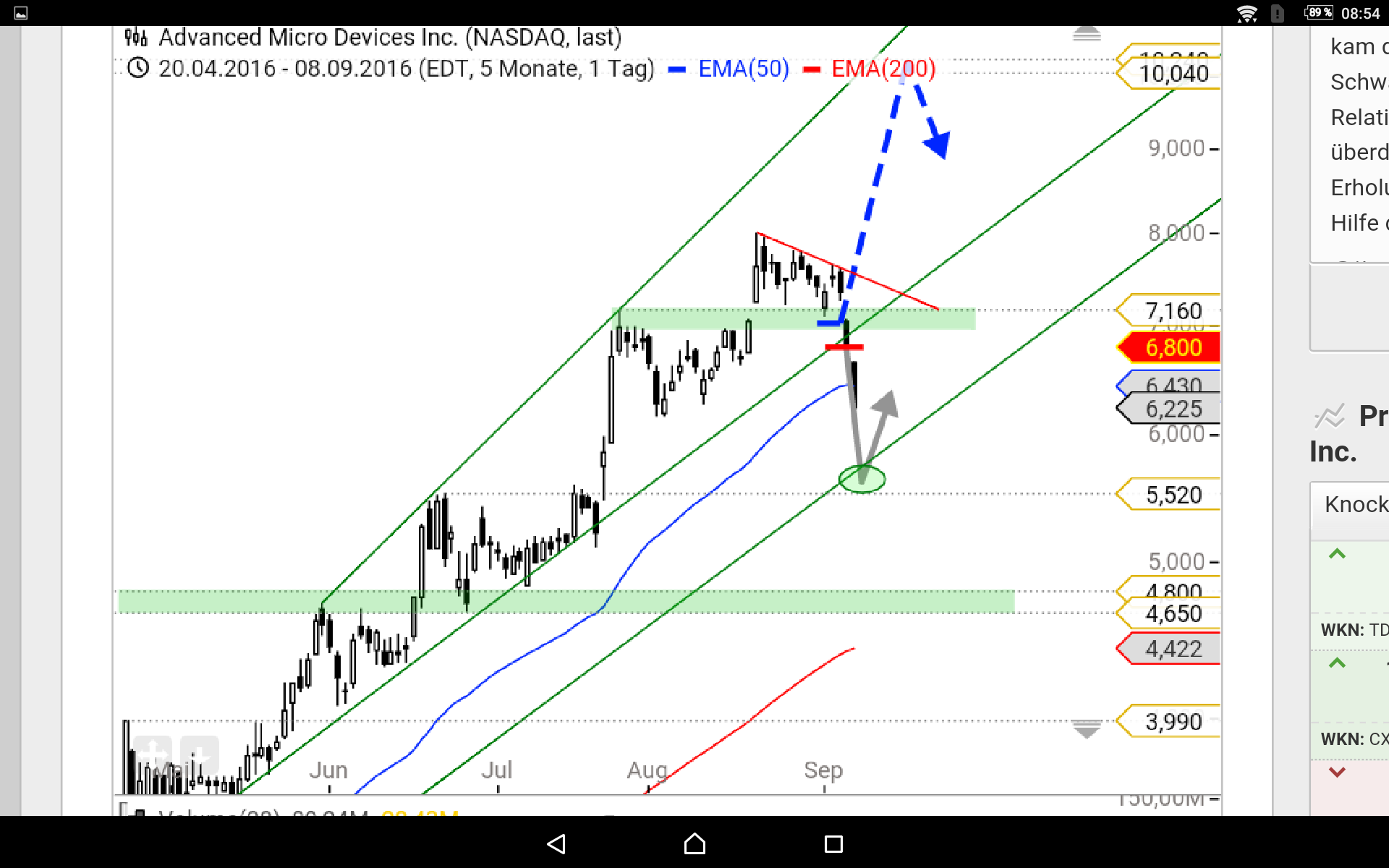hatte mich im 3-Monatschart an den Tiefpunkten 4.32, 4.72, 5.22 orientiert. Zieht man die Linie weiter kommt man ziemlich genau auf den heutigen Abschluss. Aber da dass nur Kritzeleien meinerseits waren und ich wirklich kompletter Anfänger bin kann man dass ganze natürlich getrost über den Haufen werfen.