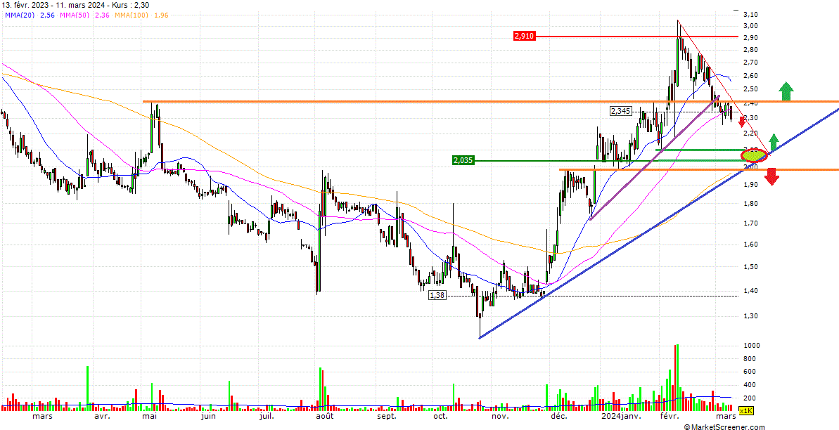 Chartbild nicht auch bei 2,23/2,22 Euro einen Widerstand? Der Kurs hat jetzt schon mehrmals dort nach oben gedreht