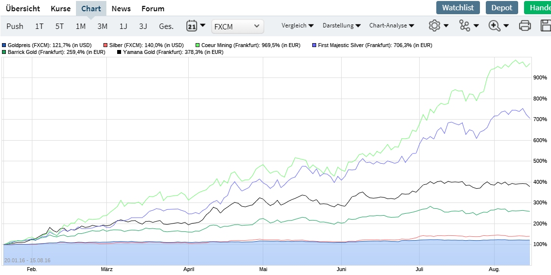 Beim letzten Aufschwung der EM in 2016 kann man sich die Entwicklung der Produzenten auch prima anschauen. Auch hier hat Coeur Mining das Rennen gemacht. Sollten sich die Preise ähnlich entwickeln wie damals wird es für einige eine Party geben. Bisher hängen die Minen allerdings dem EM Preisen hinterher. Schade eigentlich... ;)