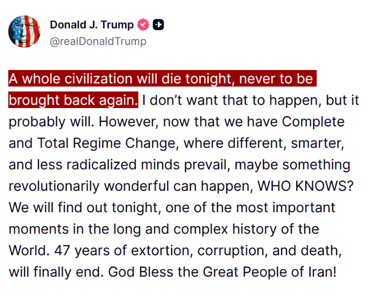Trump droht mit Auslöschung der iranischen Zivilisation, er eskaliert also wieder. Der Iran geht die Eskalation wieder mit, die Tehran Times berichtet, dass der Iran alle Verhandlungskanäle (auch und gerade die indirekten) nun geschlossen habe.